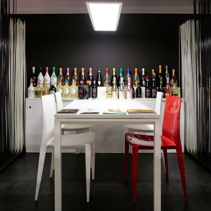 Metal table with laminated top by Doimo. Matériel partiallement endommagé, à voir dans notre outlet avant achat.